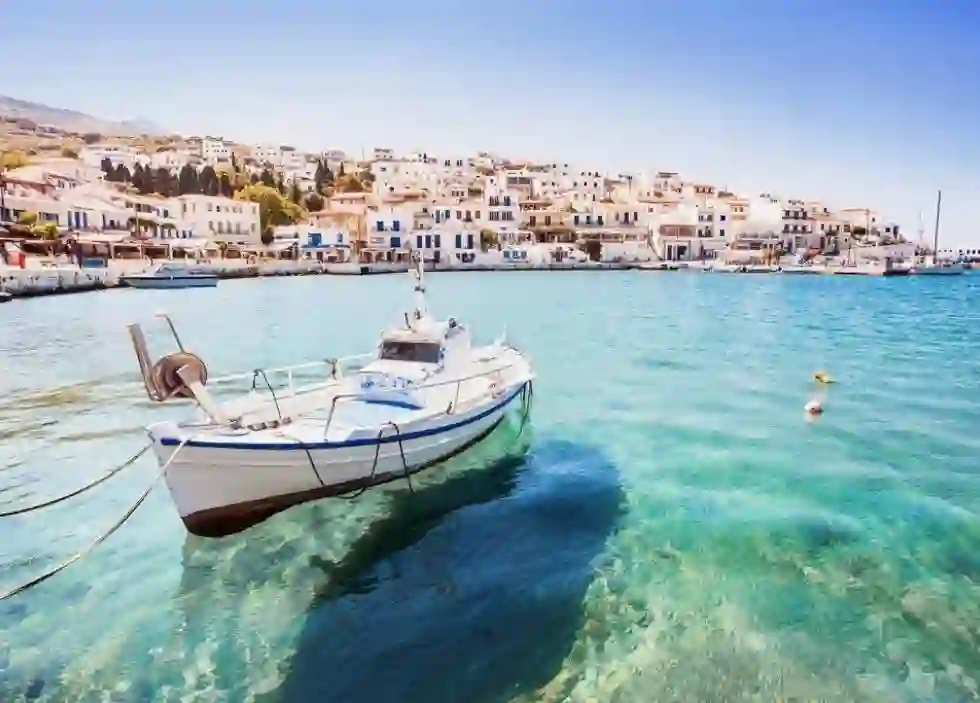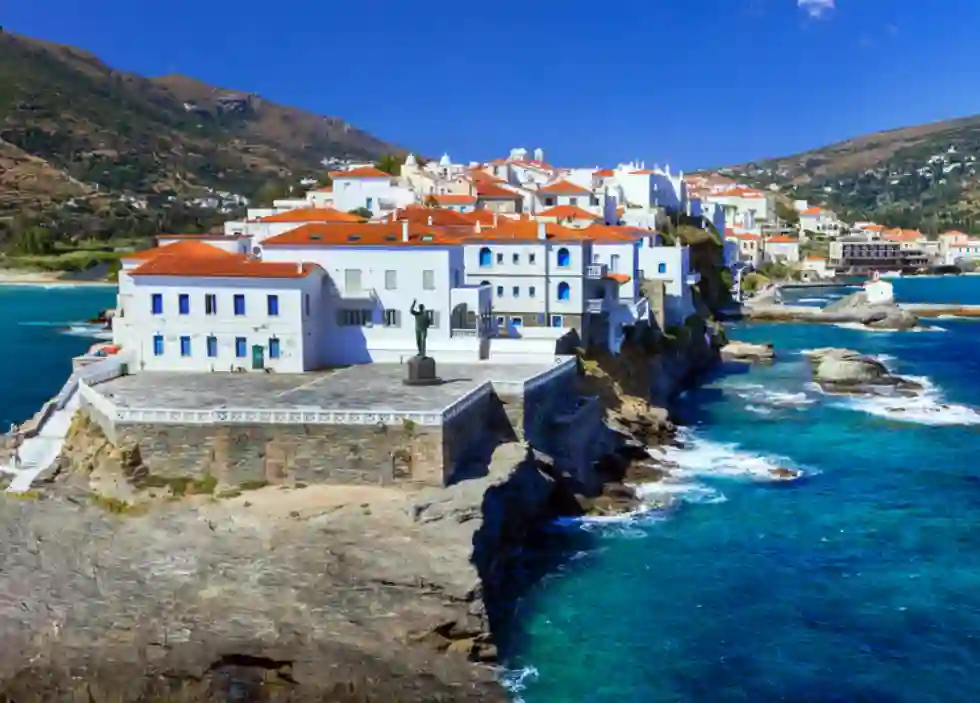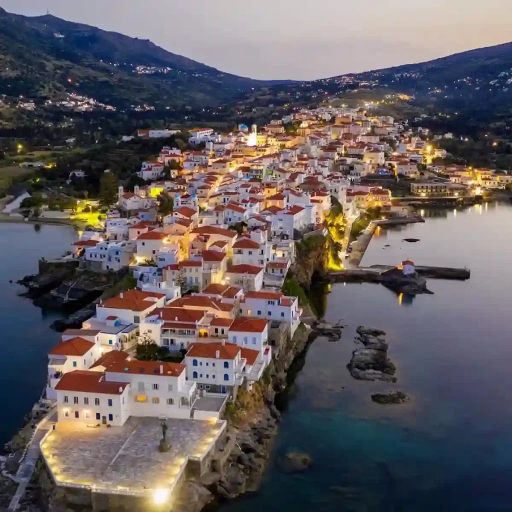 Explore the lush valleys, rocky landscapes, and serene beaches of Andros. Unlike its Cycladic neighbors, Andros is rich with springs, streams, and greenery.